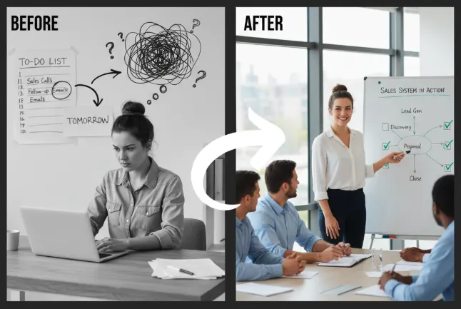 Before: You put off sales tasks, conversations feel awkward, and revenue is inconsistent.